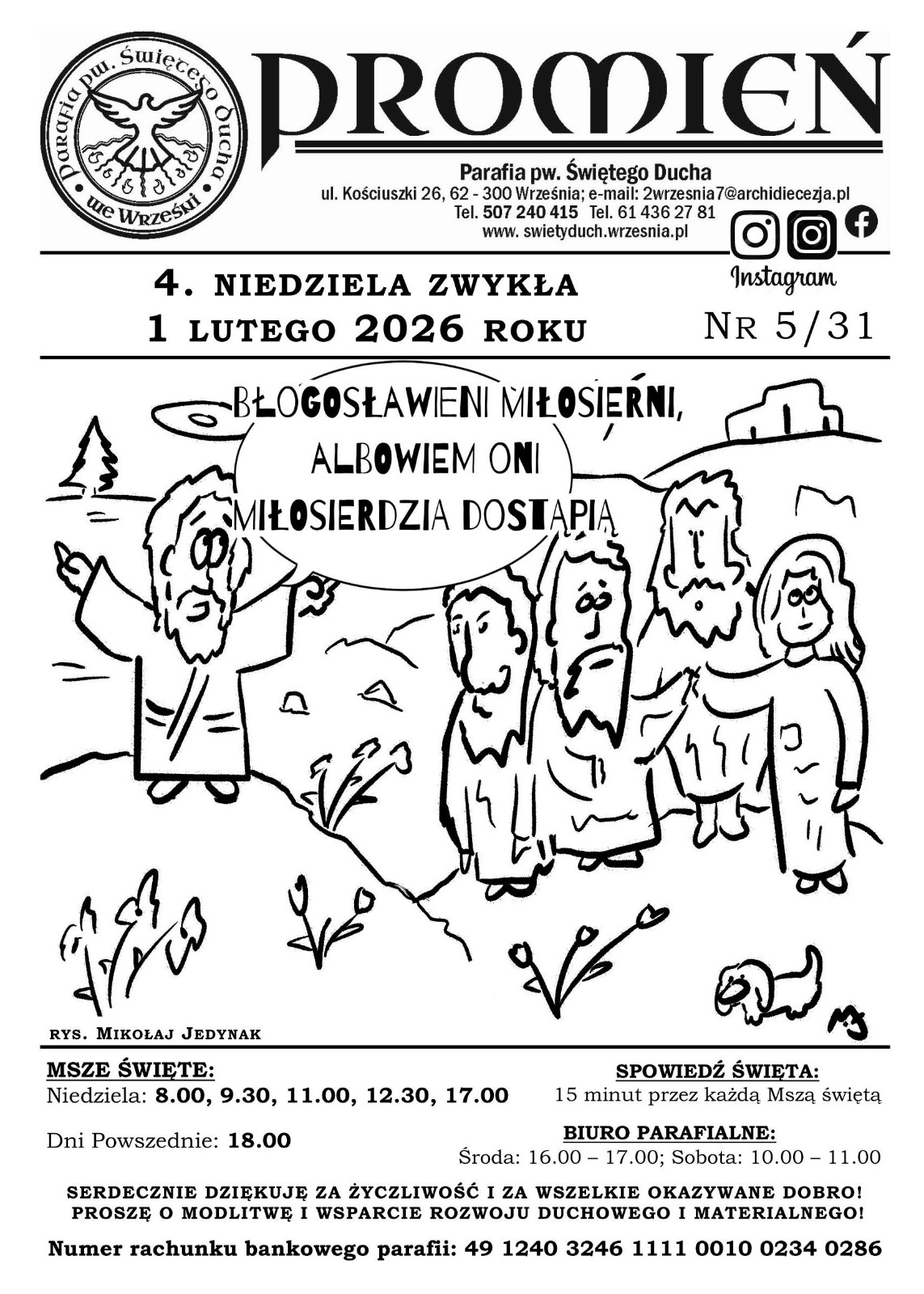 Od Nowego Roku Kalendarzowego będzie można przekazywać 1,5% należnego podatku dochodowego za rok 2025 r. na rzecz celów charytatywnych naszej parafii. Zachęcamy Tych, którzy „mogą i chcą” do wspierania naszej wspólnoty w formie darowizn, które wykorzystujemy na cele charytatywne parafii – wyjazdy dla dzieci i młodzieży. (Caritas Archidiecezji Gnieźnieńskiej – KRS 0000195886, koniecznie należy napisać: Parafialny Zespół Caritas (PZC) Świętego Ducha we Wrześni).